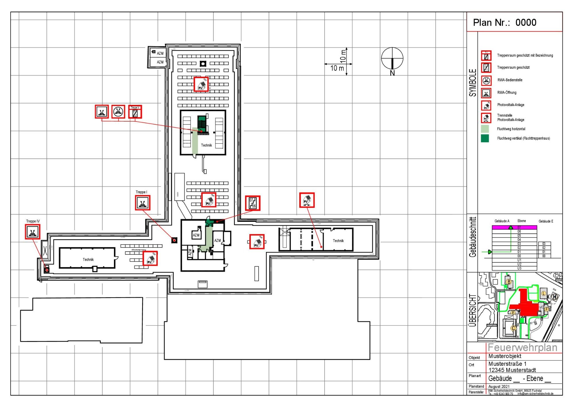 Feuerwehrpläne bestehen in der Regel aus einem Lage- und/oder Übersichtsplan, einem Objektplan, Geschossplänen und je nach Gegebenheit noch aus noch diversen anderen Detailplänen.