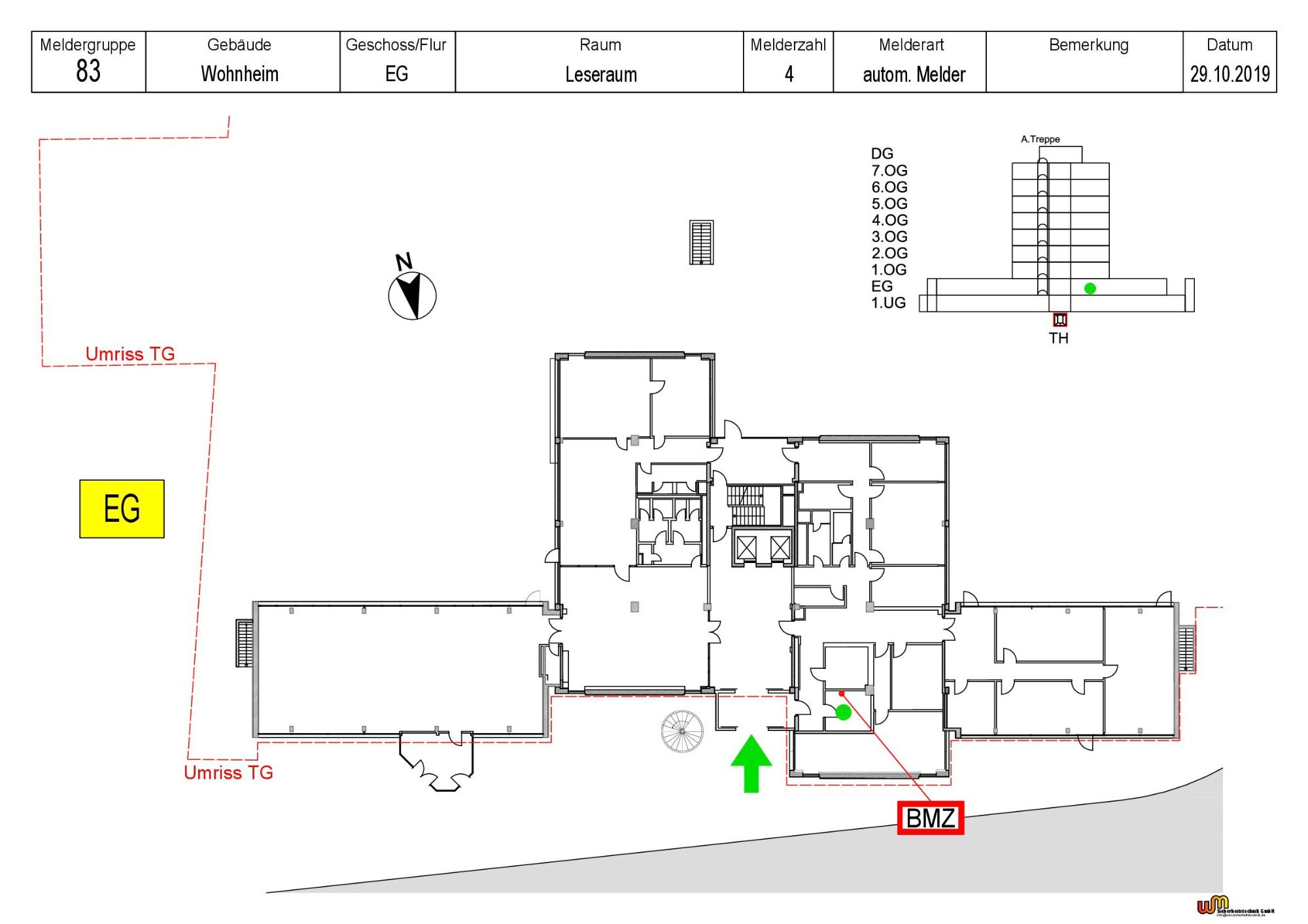 Im Blattkopf werden die von der Feuerwehr benötigten Informationen, wie der Meldergruppe, Gebäude, Geschoss/Etage, Melderart, ... angegeben.